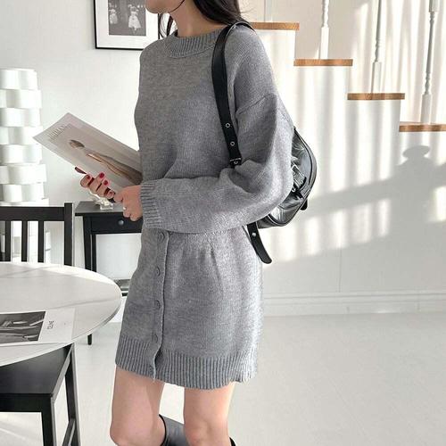 [셀럽하우스]미니 FAHT0988 베이직 버튼 스커트 투피스 니트 세트