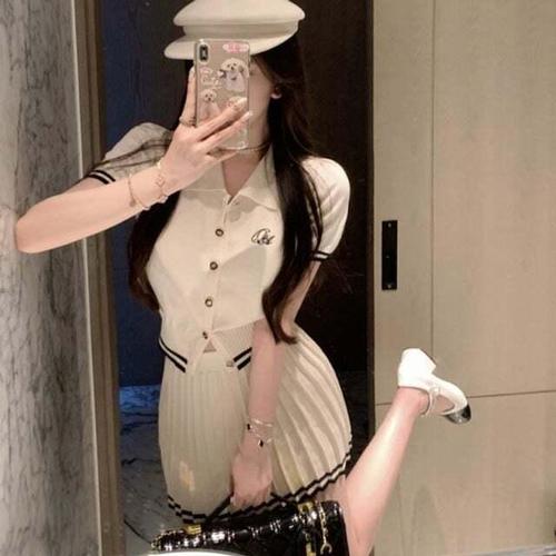 [셀럽하우스]버튼 EOPI3348 미니 스커트 투피스 니트 세트 일체형 깔끔한