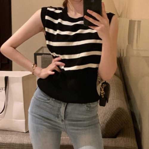 슈팅스타 / 스트라이프 버튼 옆트임 라운드넥 민소매 나시 조끼