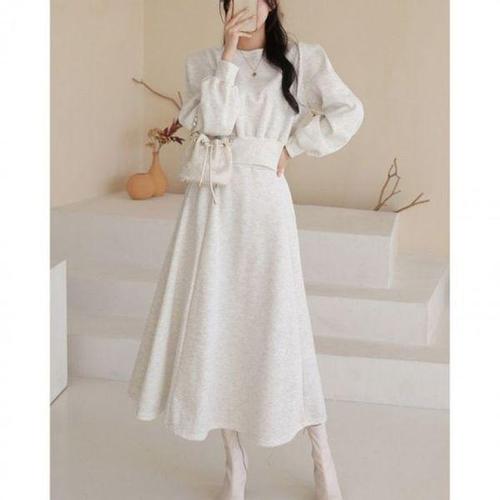 [에이치플러스몰]주름 맨투맨티고무줄 롱핏 플레어스커트 보아 캐주얼 세트아이템