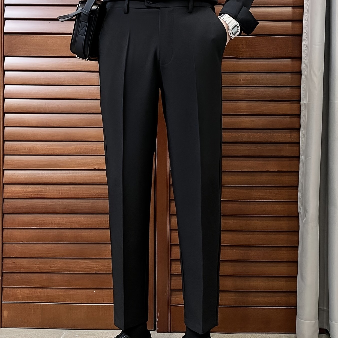 TEMU 【경량 디자인】 남성용 슬림핏 캐주얼 비즈니스 정장 바지 - 스타일리시한 솔리드 블랙, 경량 폴리에스터, 레그 디자인, 사무실 또는 반정장 착용에 완벽함, 비즈니스 캐주얼 팬츠 | 모던 테일러드 트라우저 | 노치 라펠 스타일