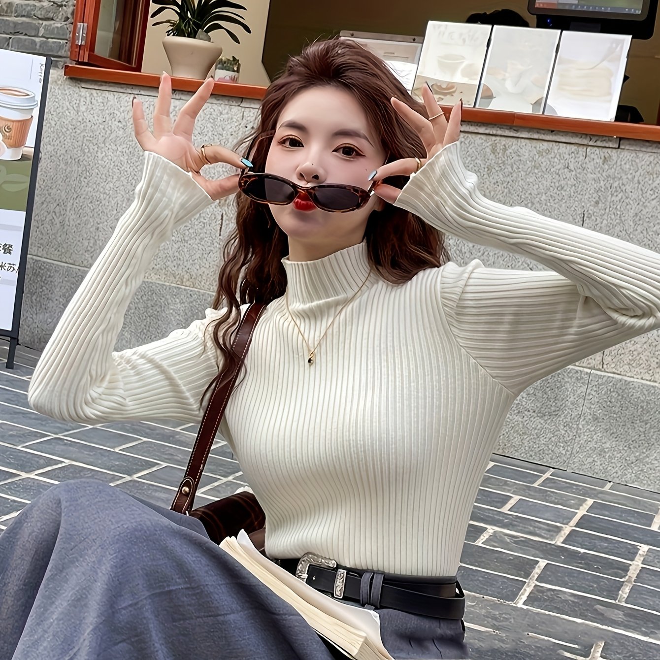 TEMU 하이넥 스웨터 베이스 셔츠 가을 겨울 한국 스타일 의상 두꺼운 안감 상의 패셔너블 셔츠