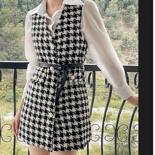 [셀럽하우스]하객룩 ZWRL2583 포인트룩 진주버튼 트위드 벨트포함 롱 조끼