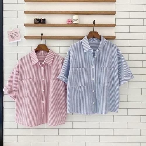 [다잇템_패션]여자 반팔 코튼셔츠 폴딩 지지미 단가라 셔츠