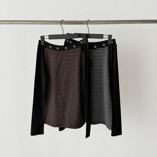 [옷자락]여자 오프숄더 끈 아일렛 단가라 배색 롱슬리브 티셔츠