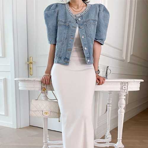 슈팅스타 / 퍼프소매 진주장식 크롭 숏 반팔 데님 청자켓