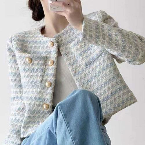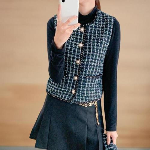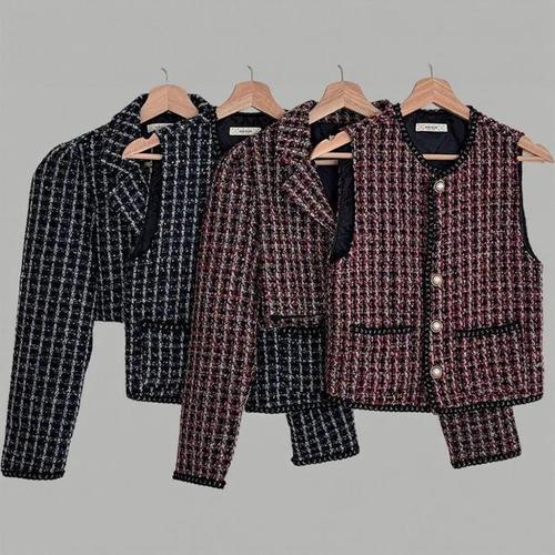 [신상오픈런]여성 크롭 트위드 자켓 세트 진주 버튼 배색 조끼 (42009535)