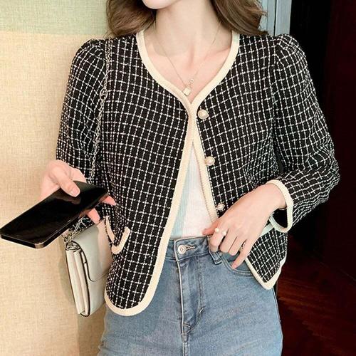 besteffie 여성 트위드 자켓 숏 하객룩 진주 버튼 봄 가을 간절기 긴팔 패션 달콤한 배색 브이넥 데일리 자켓 V15
