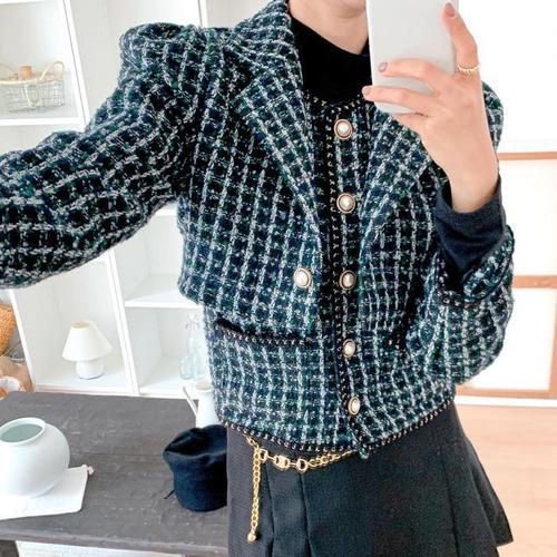 진주단추 노카라 트위드 자켓 간절기 숏 자켓