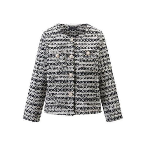 [셀럽하우스]스트라이프 WHNQ5893 노카라 트위드 자켓 진주 단추 데이트룩