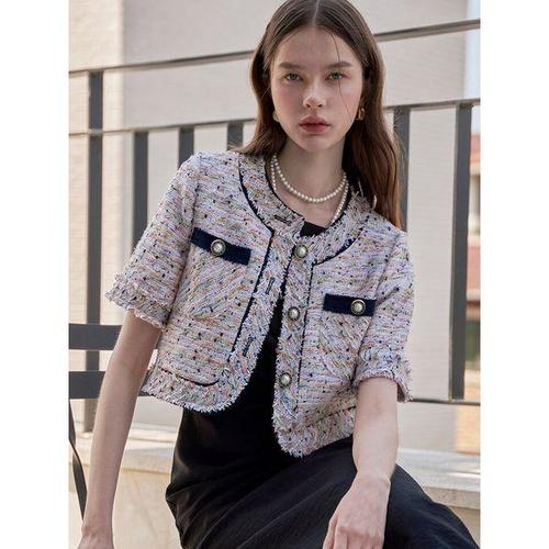 [신상오픈런]여성 반팔 트위드 자켓 노카라 진주 버튼 오피스 스타일 (37001082)