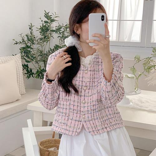 [오너클랜]인기상품 간절기 트위드 진주단추 숏 자켓 노카라 [WFJ8PTQ_251031]