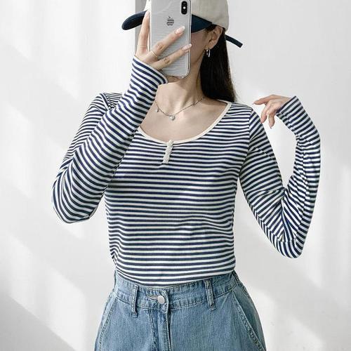 [신상오픈런]라운드넥쫄티 단가라 슬림핏 스판 코튼 스트라이프티셔츠 (30321851)