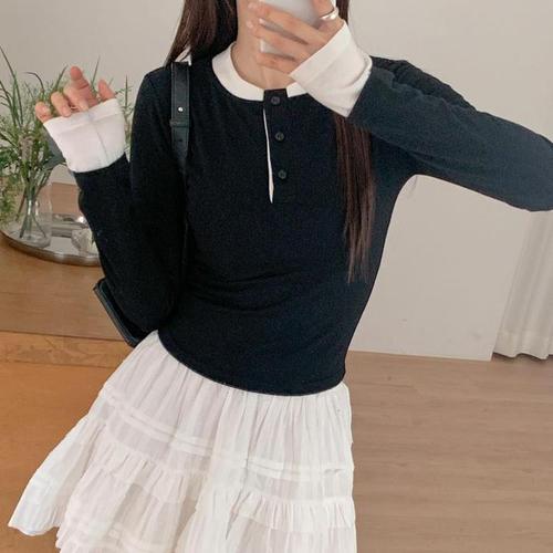 [신상오픈런]투톤 이중 라운드넥 쫄티 스판 레이어드 긴팔티셔츠 (30920894)