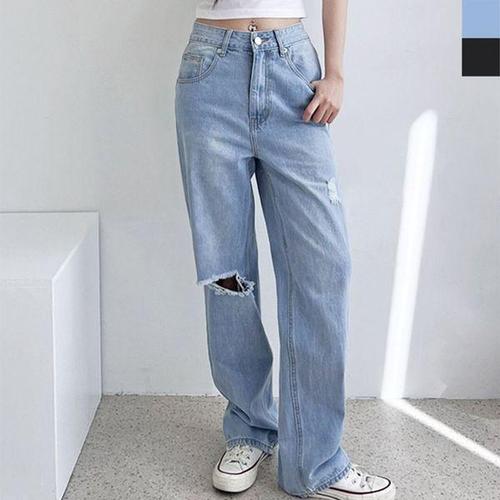 [옷자락]여자 세미와이드 캐주얼 찢청 데미지 데님팬츠