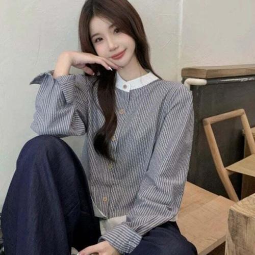 [셀럽하우스]데이트룩 IGBK9475 캠퍼스룩 배색 차이나카라 스트라이프 셔츠
