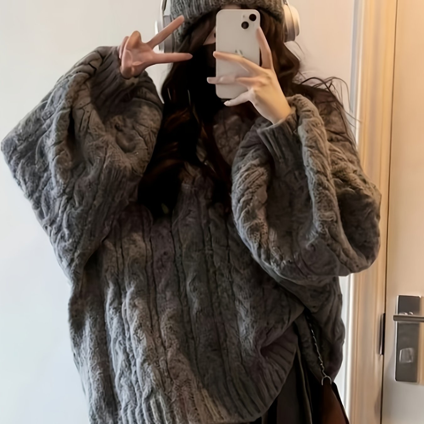 TEMU 프린트 디자인 - 무질감, 릴랙스 빈티지 스타일, 도톰한 V넥 루즈핏 니치 숏 케이블 스웨터, 가을/겨울 한국 스타일 활용도 높은 상의