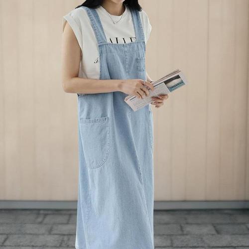 [신상오픈런]여성 여름 청멜빵 포켓 슬리브리스 롱 드레스 77사이즈 (34705442)