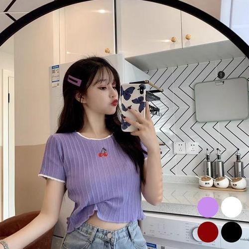 [에이치플러스몰]체리 반크롭 반팔 여름 예쁜 데일리 여성 티셔츠 자수
