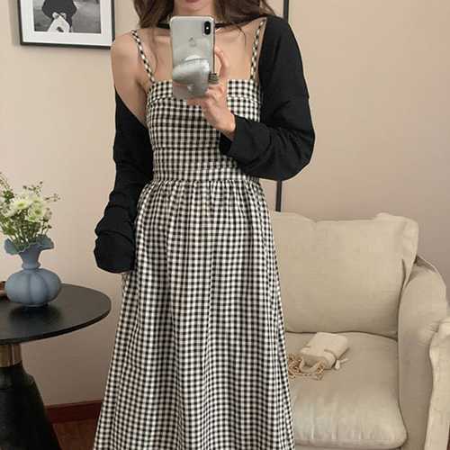 슈팅스타 / 스퀘어넥 끈나시 체크 롱 원피스 볼레로 가디건 세트