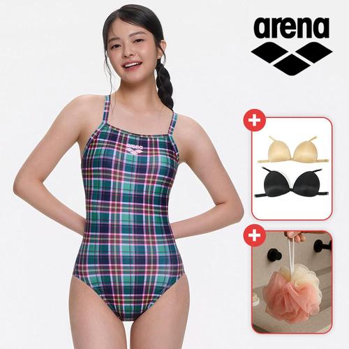 [아레나]아레나 컨트리 체크 원피스 싱글 수퍼플라이백 수영복 A5FL1LO05+고리브라+샤워볼