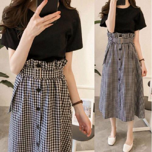 [셀럽하우스]롱 GQEZ8443 체크 캐주얼 스커트 반팔 투피스 세트