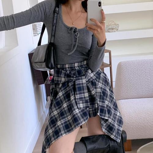 [신상오픈런]여자 셔츠치마 체크 플레어 매듭 키치 밴딩 미니스커트 (41115440)