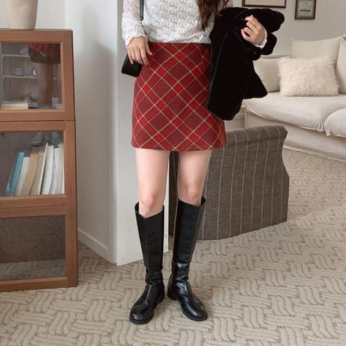 [신상오픈런]체크치마 h라인 슬림핏 딱붙 빨간색 일자미니스커트 (29414555)