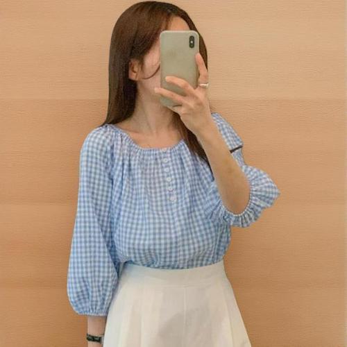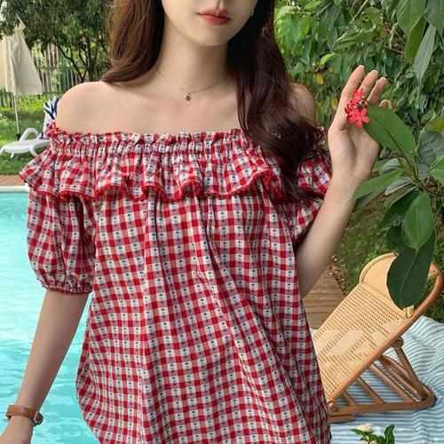 [신상오픈런]|CMH4329|여성용 체크 패턴 오프숄더 긴팔 블라우스 봄 여름 루즈핏