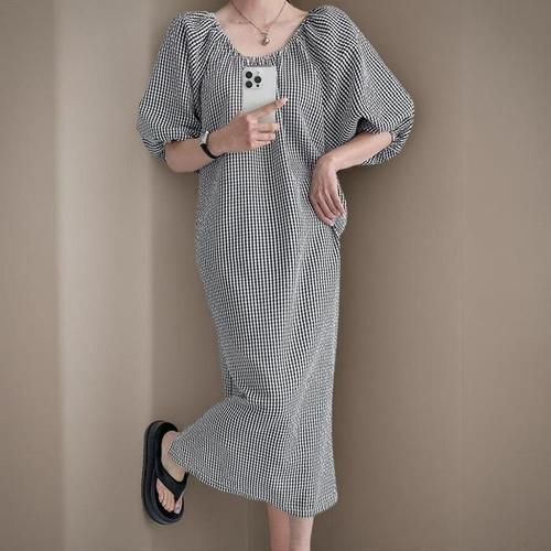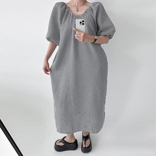 [신상오픈런]여성 체크 오프숄더 투웨이 벌룬 트임 박시 롱드레스 (39096201)