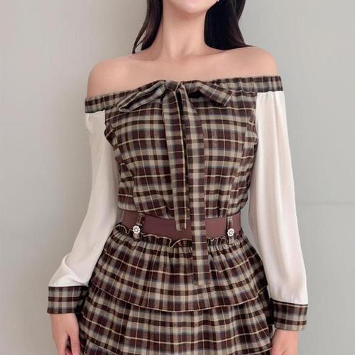 [신상오픈런]여성 체크 패턴 슬림핏 가을 오프숄더 리본 블라우스 (42510272)