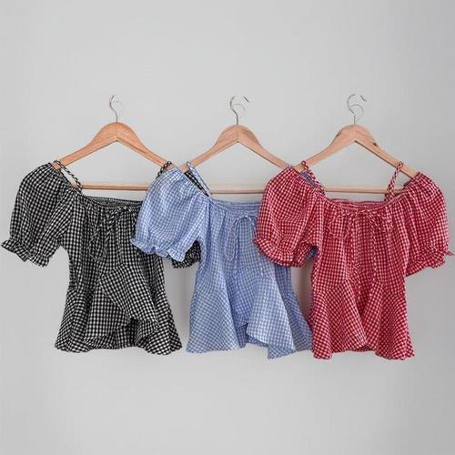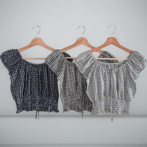 [신상오픈런]여성 체크 리본 크롭 블라우스 오프숄더 스모크밴딩 (38564908)