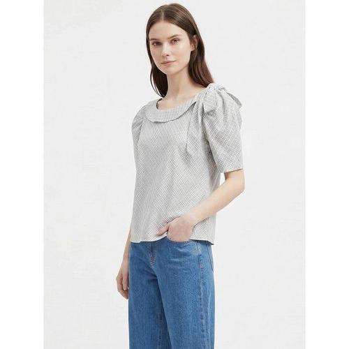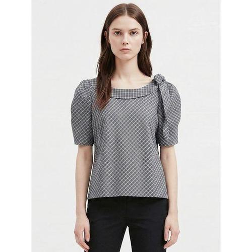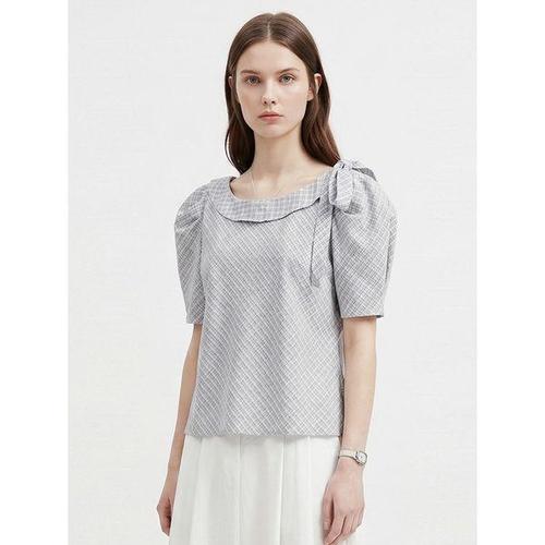 [샵앤]국산 여성 리본타이 보트넥 체크 반팔 블라우스 SIU-WBL-21120-그레이