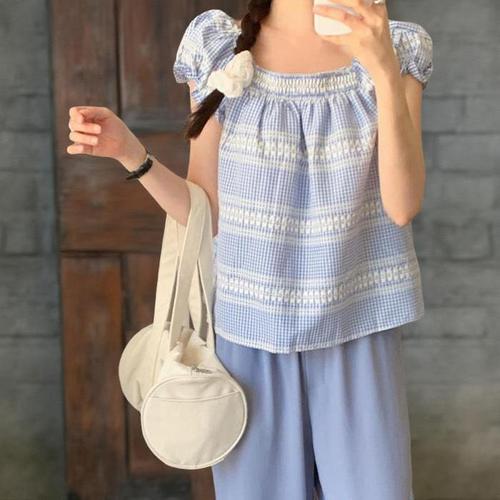 [신상오픈런]여성 여름 오프숄더 반전 가능한 체크 자수 블라우스 (34212031)