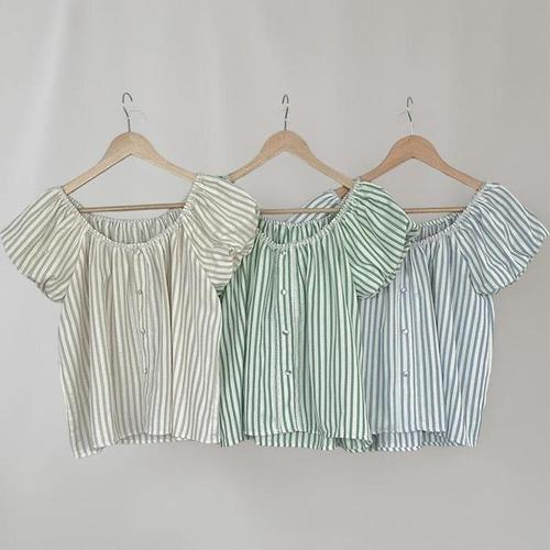 [신상오픈런]여성 레이스 퍼프 소매 오프숄더 스트라이프 버튼 블라우스 (38169719)