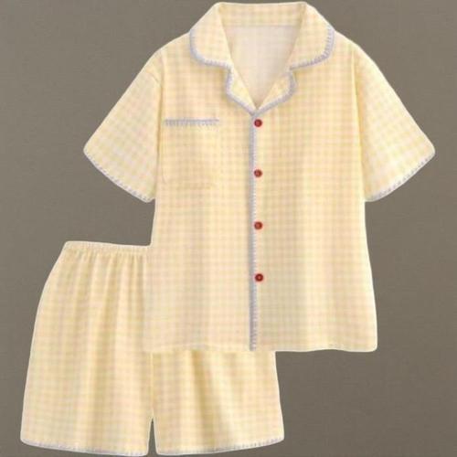 [신상오픈런]여성 체크 패턴 포켓 반팔 셔츠와 반바지 홈웨어 잠옷 세트 (41316098)