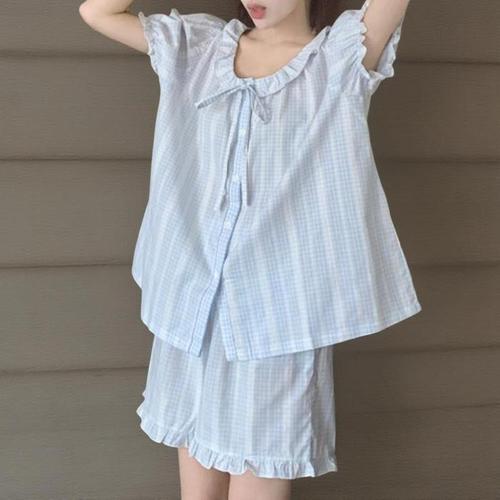 [신상오픈런]여성 체크 프릴 반팔 반바지 잠옷 세트 (37001507)