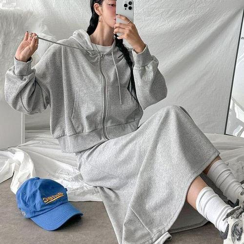 [셀러허브_여성트랜드패션]후드집업 플레어 스커트 2종 코디 상하복 세트 여성