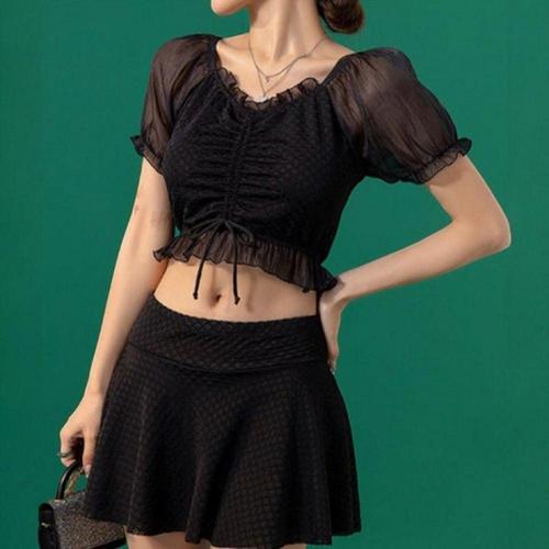 쉬폰 퍼프 소매 스트링 미들 투피스 수영복 모노키니 치마세트 WFKNQ1Y