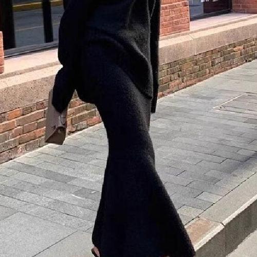 디바 밴딩 머메이드 롱스커트 라운드 크롭 긴팔 골지니트 겨울 투피스세트 (3color)
