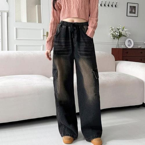 [sado]여성 청바지 머드워싱 밴딩 카고 데님 와이드 바지 사계절 SF1048W