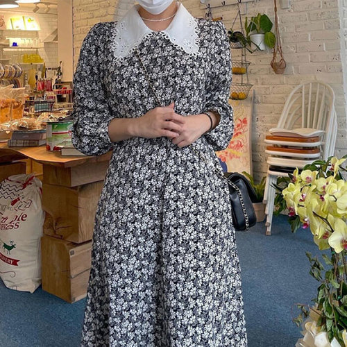 슈팅스타 / 플라워패턴 브이넥 레이스 카라 소녀스러운 원피스