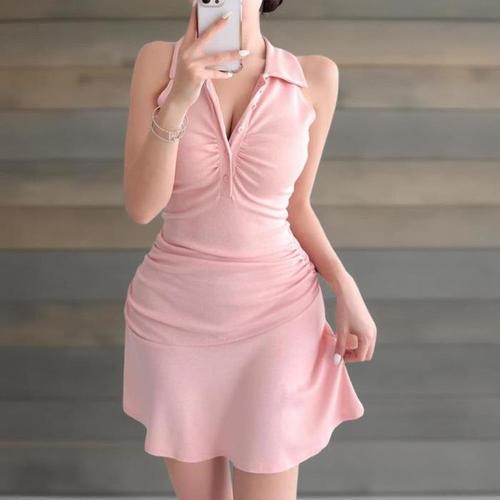 [신상오픈런]여성 민소매 카라넥 프릴 미니 원피스 단추 트임 셔링 디자인 (38541453)