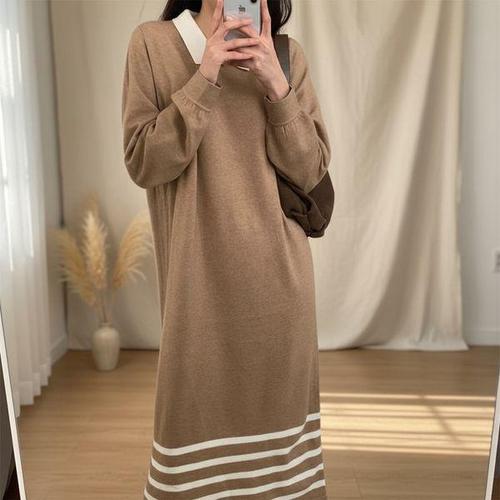 [옷자락]여성 배색 줄무늬 긴팔 니트 카라 원피스