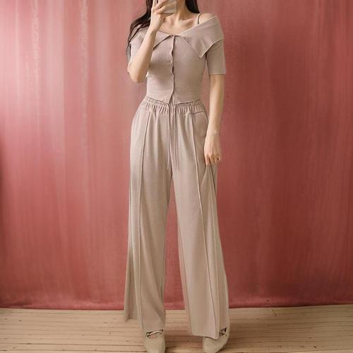 [신상오픈런]여성 오프숄더 크롭 카라 니트와 와이드 팬츠 조화 세트 (32328173)