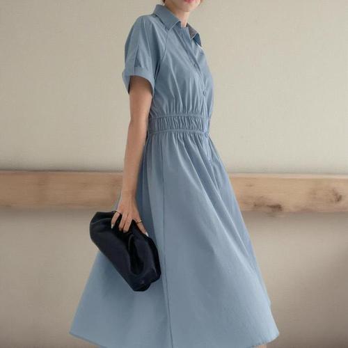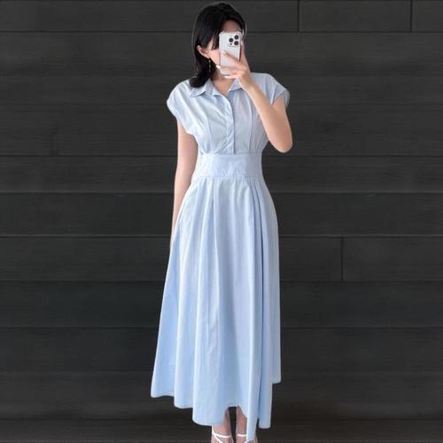 [신상오픈런]여성 카라넥 반팔 롱 원피스 허리단추 플레어 드레스 (41006136)