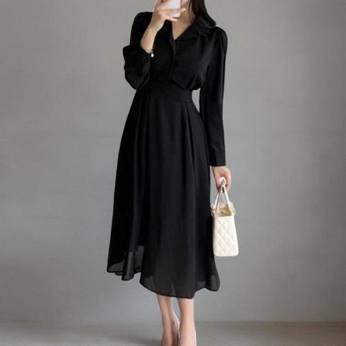 [신상오픈런]여성용 클래식 플레어 롱 원피스 카라넥 볼륨업 디자인 (42512884)