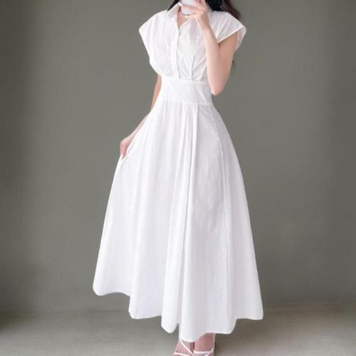 [신상오픈런]여성 심플 오픈 카라 반팔 플레어 롱 드레스 (37001137)
