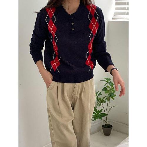 [샵앤]국산 여성 반단추 카라넥 아가일 긴팔 니트 티셔츠 21DS-WKN-4888-레드