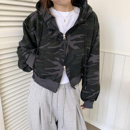 [옷자락]여자 카모 크롭 루즈핏 후드 집업